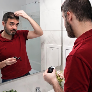 Incluso en las zonas que parecen despejadas, a menudo quedan pelos muy finos o claros. El polvo se adhiere a ellos para rellenar visualmente los huecos y crear un efecto de densidad natural. Esto es lo que permite obtener un resultado homogéneo, incluso en casos de pérdida de cabello marcada.